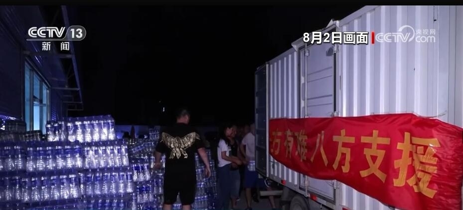 保定新發(fā)地聯(lián)農(nóng)蔬菜果品批發(fā)市場工作人員 劉立國:咱們帶來的有礦泉水,有黃瓜、西紅柿,包括面包,還有香蕉等等。一整車的物資有十幾噸。