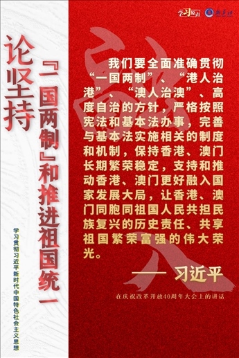 “一國(guó)兩制”是黨領(lǐng)導(dǎo)人民實(shí)現(xiàn)祖國(guó)和平統(tǒng)一的一項(xiàng)重要制度,是國(guó)家的一項(xiàng)基本國(guó)策。中國(guó)特色社會(huì)主義進(jìn)入了新時(shí)代,意味著“一國(guó)兩制”事業(yè)也進(jìn)入了新時(shí)代。不斷推進(jìn)“一國(guó)兩制”在香港、澳門(mén)的成功實(shí)踐,是中華民族偉大復(fù)興歷史進(jìn)程的重要組成部分。