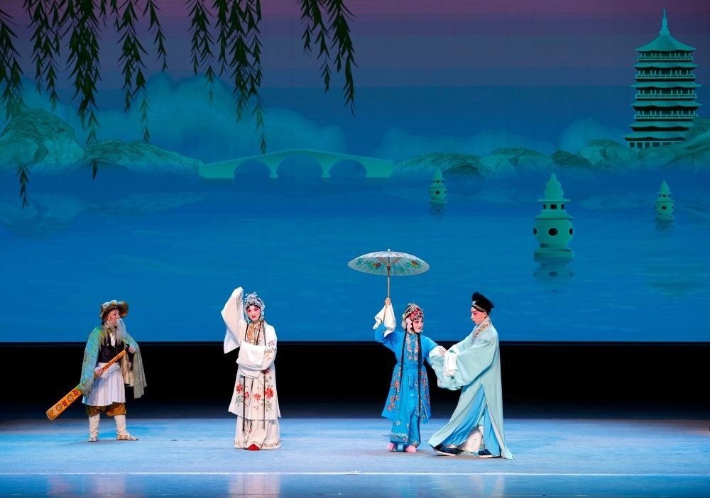 三潭印月的勝景出現(xiàn)在背景屏幕上,京劇《白蛇傳·游湖》拉開(kāi)了當(dāng)晚演出的序幕,一句“十年修得同船渡,百年修來(lái)共枕眠”將現(xiàn)場(chǎng)觀眾拉入中國(guó)民間傳說(shuō)的劇情?!赌九妓C萃》展示了表演者對(duì)于手中木偶精巧的控制能力,《中華醫(yī)藥》則將中藥的各種藥材名稱(chēng)巧妙地融合在唱詞中。最后上演的川劇《白蛇傳·金山寺》選段則集川劇表演技巧之大成,白素貞的“烏龍絞柱”等技術(shù)動(dòng)作生動(dòng)模擬了蛇類(lèi)的形態(tài),而紫金鐃缽的變臉絕技更是引得全場(chǎng)陣陣歡呼。