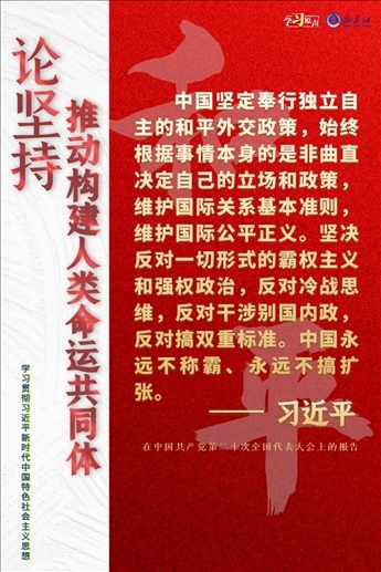 當(dāng)前,世界之變、時代之變、歷史之變正以前所未有的方式展開。人類社會面臨前所未有的挑戰(zhàn)。世界又一次站在歷史的十字路口,何去何從取決于各國人民的抉擇。中國始終堅持維護(hù)世界和平、促進(jìn)共同發(fā)展的外交政策宗旨,致力于推動構(gòu)建人類命運(yùn)共同體。