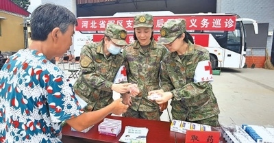 8月9日,河北省軍區(qū)石家莊第三干休所醫(yī)生為當(dāng)?shù)厥転?zāi)群眾義診并發(fā)放藥品。劉松峰攝(人民視覺)