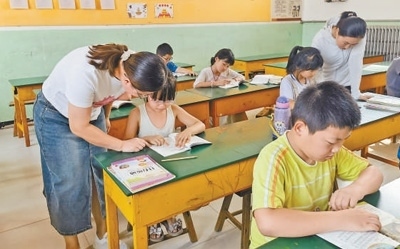 8月8日,河北省獻(xiàn)縣樂壽鎮(zhèn)東翟小學(xué)安置點(diǎn)內(nèi),學(xué)校老師為學(xué)生輔導(dǎo)功課。本報(bào)記者 邵玉姿攝