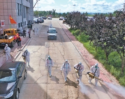 8月8日,黑龍江省尚志市,工作人員對(duì)洪水過(guò)后的道路進(jìn)行消毒。張藝開 尚鵬程攝影報(bào)道