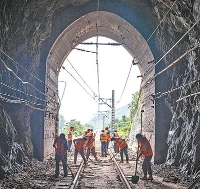 8月7日,北京市門頭溝區(qū)王平鎮(zhèn),中國(guó)鐵路北京局北京西工務(wù)段工作人員在清理路基和軌道。本報(bào)記者 張武軍攝