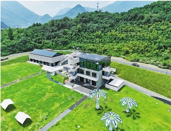 圖為余村未來(lái)圖書(shū)館,該建筑主要通過(guò)鋪設(shè)在屋頂上的光伏發(fā)電系統(tǒng)和“光伏樹(shù)”供電(無(wú)人機(jī)照片)。新華社記者 翁忻旸 攝