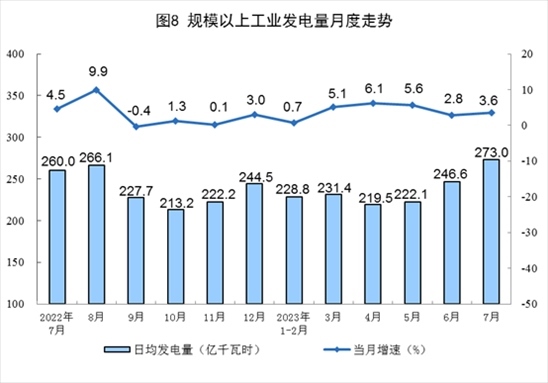 電力生產(chǎn)有所加快。7月份,發(fā)電量8462億千瓦時,同比增長3.6%,增速比6月份加快0.8個百分點,日均發(fā)電273.0億千瓦時。1—7月份,發(fā)電量50130億千瓦時,同比增長3.8%。