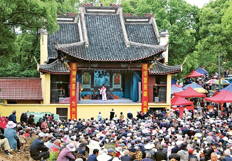 為豐富群眾文化生活,江蘇省南京市高淳區(qū)椏溪街道藍(lán)溪村專門邀請(qǐng)杭州青年越劇團(tuán)來(lái)村里演出,讓村民在家門口享受文化大餐。圖為2023年5月7日,藍(lán)溪村大山戲樓上,演員正在表演越劇《紅樓夢(mèng)》。 人民圖片 高曉平/攝
