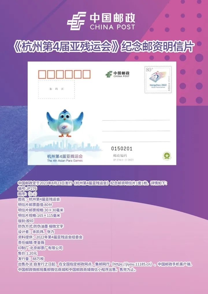 今天,中國(guó)郵政還發(fā)行了《杭州第4屆亞殘運(yùn)會(huì)》紀(jì)念郵資明信片一套1枚,編號(hào)為JP276。郵資圖為杭州亞殘運(yùn)會(huì)會(huì)徽,主體表現(xiàn)杭州亞殘運(yùn)會(huì)名稱(chēng)和吉祥物飛飛,襯以杭州城市剪影,體現(xiàn)“兩個(gè)亞運(yùn),同樣精彩”的辦賽理念,激勵(lì)殘疾人運(yùn)動(dòng)員在競(jìng)技舞臺(tái)上,展現(xiàn)勇于挑戰(zhàn)、戰(zhàn)勝自我、創(chuàng)造幸福的良好精神風(fēng)貌。
