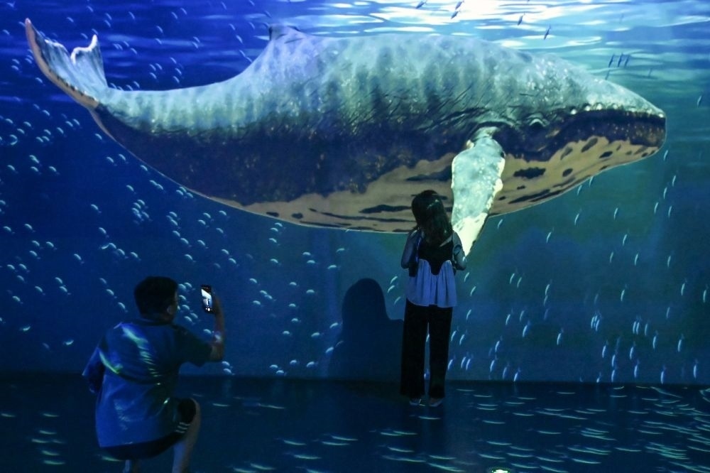 7月29日,游客在國家海洋博物館體驗沉浸式互動數字藝術作品《鯨奇物語》光影藝術展。新華社記者 孫凡越 攝