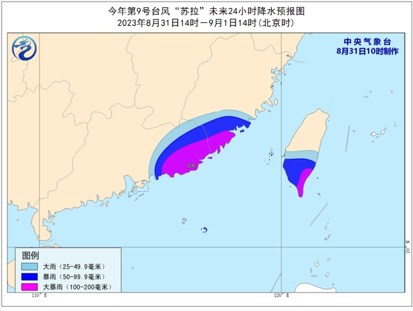 降水預報:8月31日14時至9月1日14時,廣東東部、福建南部、臺灣島中南部等地的部分地區(qū)有大到暴雨,其中,廣東東南部、福建東南部、臺灣島東南部等地部分地區(qū)有大暴雨(100-200毫米)。