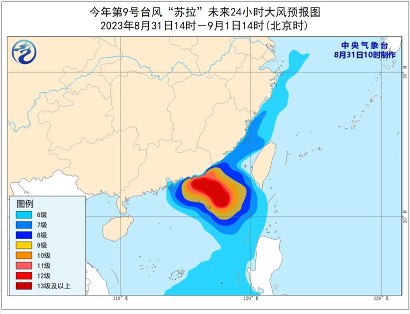 大風預報:8月31日14時至9月1日14時,巴士海峽、臺灣海峽、南海東部和南部、福建沿海、廣東中東部沿海、臺灣島南部沿海、東沙群島將有6-8級、陣風9-10級的大風,其中南海東北部、東沙群島的風力有9-11級,部分海域風力可達12-13級,“蘇拉”中心經過的附近海面風力有14-17級、陣風17級以上。