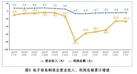 1—7月份,規(guī)模以上電子信息制造業(yè)實(shí)現(xiàn)營(yíng)業(yè)收入7.98萬(wàn)億元,同比下降3.8%,較上半年降幅收窄0.4個(gè)百分點(diǎn);營(yíng)業(yè)成本6.98萬(wàn)億元,同比下降3.3%;實(shí)現(xiàn)利潤(rùn)總額2763億元,同比下降26.4%,較上半年降幅加深1.2個(gè)百分點(diǎn);營(yíng)業(yè)收入利潤(rùn)率為3.5%,較上半年下降0.1個(gè)百分點(diǎn)。
