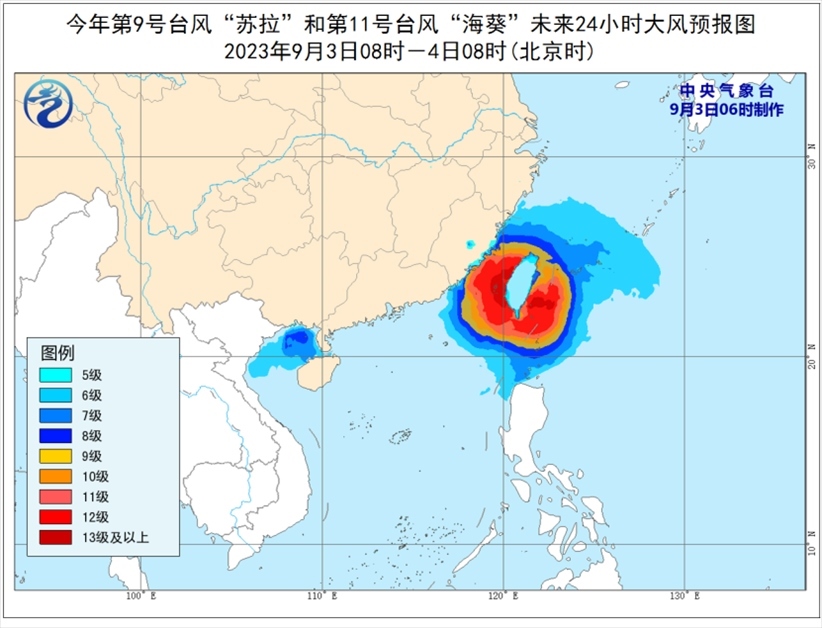 降水預(yù)報:9月3日08時至4日08時,受“蘇拉”和“??庇绊?,廣西中南部、廣東西南部、臺灣島等地部分地區(qū)有大到暴雨,其中,廣西中南部、臺灣島中東部等地部分地區(qū)有大暴雨,臺灣島東部部分地區(qū)有特大暴雨(250-600毫米)。