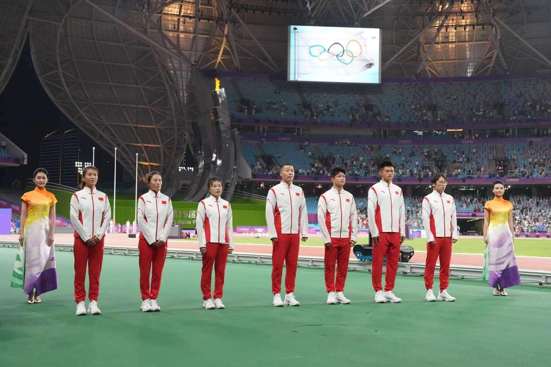 10月4日晚,在杭州亞運(yùn)會田徑比賽全部結(jié)束后,中國奧委會為蘇炳添、謝震業(yè)、吳智強(qiáng)、湯星強(qiáng)、切陽什姐、劉虹和呂秀芝補(bǔ)發(fā)了奧運(yùn)會獎牌。