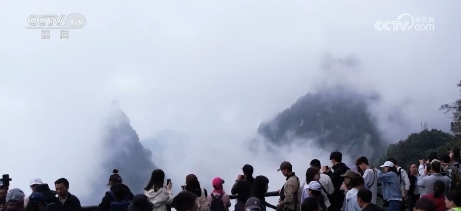 在湖南張家界,天門山國家森林公園迎來了旅游高峰。雨后出現(xiàn)的云海景觀,好似一幅山水畫卷,漫天的云海圍繞著群峰翻騰起伏,顯得十分靈動秀美,吸引了不少游客“打卡”拍照。這個假期,當?shù)夭扇×藢嵜品謺r預約、無紙化智慧入園、提前售票時間等多種舉措引導客流。
