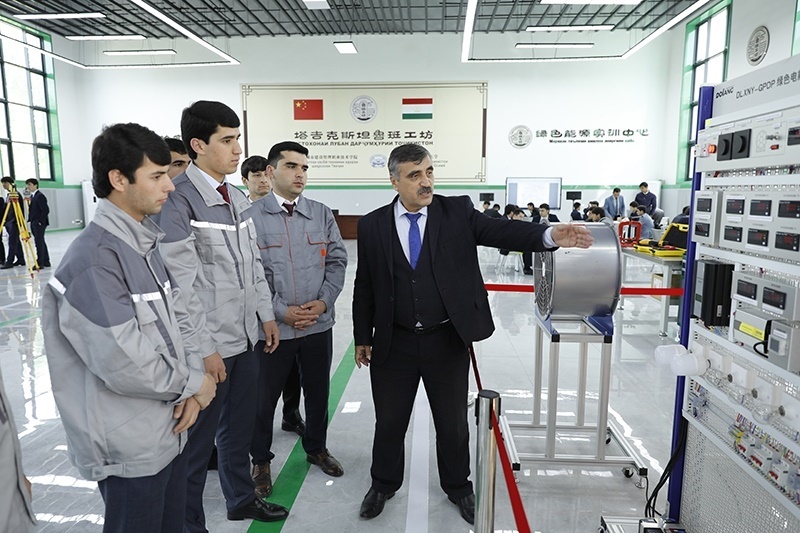 2023年4月12日,在塔吉克斯坦首都杜尚別的魯班工坊內,塔方教授向學生講解綠色電能展示平臺的功能與使用方法。