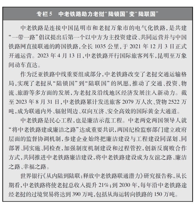 經(jīng)濟(jì)走廊和國(guó)際通道建設(shè)卓有成效。共建國(guó)家共同推進(jìn)國(guó)際骨干通道建設(shè),打造連接亞洲各次區(qū)域以及亞歐非之間的基礎(chǔ)設(shè)施網(wǎng)絡(luò)。中巴經(jīng)濟(jì)走廊方向,重點(diǎn)項(xiàng)目穩(wěn)步推進(jìn),白沙瓦-卡拉奇高速公路(蘇庫(kù)爾至木爾坦段)、喀喇昆侖公路二期(赫韋利揚(yáng)-塔科特段)、拉合爾軌道交通橙線項(xiàng)目竣工通車,薩希瓦爾、卡西姆港、塔爾、胡布等電站保持安全穩(wěn)定運(yùn)營(yíng),默拉直流輸電項(xiàng)目投入商業(yè)運(yùn)營(yíng),卡洛特水電站并網(wǎng)發(fā)電,拉沙卡伊特別經(jīng)濟(jì)區(qū)進(jìn)入全面建設(shè)階段。新亞歐大陸橋經(jīng)濟(jì)走廊方向,匈塞鐵路塞爾維亞貝爾格萊德-諾維薩德段于2022年3月開通運(yùn)營(yíng),匈牙利布達(dá)佩斯-克萊比奧段啟動(dòng)軌道鋪設(shè)工作;克羅地亞佩列沙茨跨海大橋迎來(lái)通車一周年;雙西公路全線貫通;黑山南北高速公路順利建成并投入運(yùn)營(yíng)。中國(guó)-中南半島經(jīng)濟(jì)走廊方向,中老鐵路全線建成通車且運(yùn)營(yíng)成效良好,黃金運(yùn)輸通道作用日益彰顯;作為中印尼共建“一帶一路”的旗艦項(xiàng)目,時(shí)速350公里的雅萬(wàn)高鐵開通運(yùn)行;中泰鐵路一期(曼谷-呵叻)簽署線上工程合同,土建工程已開工11個(gè)標(biāo)段(其中1個(gè)標(biāo)段已完工)。中蒙俄經(jīng)濟(jì)走廊方向,中俄黑河公路橋、同江鐵路橋通車運(yùn)營(yíng),中俄東線天然氣管道正式通氣,中蒙俄中線鐵路升級(jí)改造和發(fā)展可行性研究正式啟動(dòng)。中國(guó)-中亞-西亞經(jīng)濟(jì)走廊方向,中吉烏公路運(yùn)輸線路實(shí)現(xiàn)常態(tài)化運(yùn)行,中國(guó)-中亞天然氣管道運(yùn)行穩(wěn)定,哈薩克斯坦北哈州糧油專線與中歐班列并網(wǎng)運(yùn)行。孟中印緬經(jīng)濟(jì)走廊方向,中緬原油和天然氣管道建成投產(chǎn),中緬鐵路木姐-曼德勒鐵路完成可行性研究,曼德勒-皎漂鐵路啟動(dòng)可行性研究,中孟友誼大橋、多哈扎里至科克斯巴扎爾鐵路等項(xiàng)目建設(shè)取得積極進(jìn)展。在非洲,蒙內(nèi)鐵路、亞吉鐵路等先后通車運(yùn)營(yíng),成為拉動(dòng)?xùn)|非乃至整個(gè)非洲國(guó)家縱深發(fā)展的重要通道。