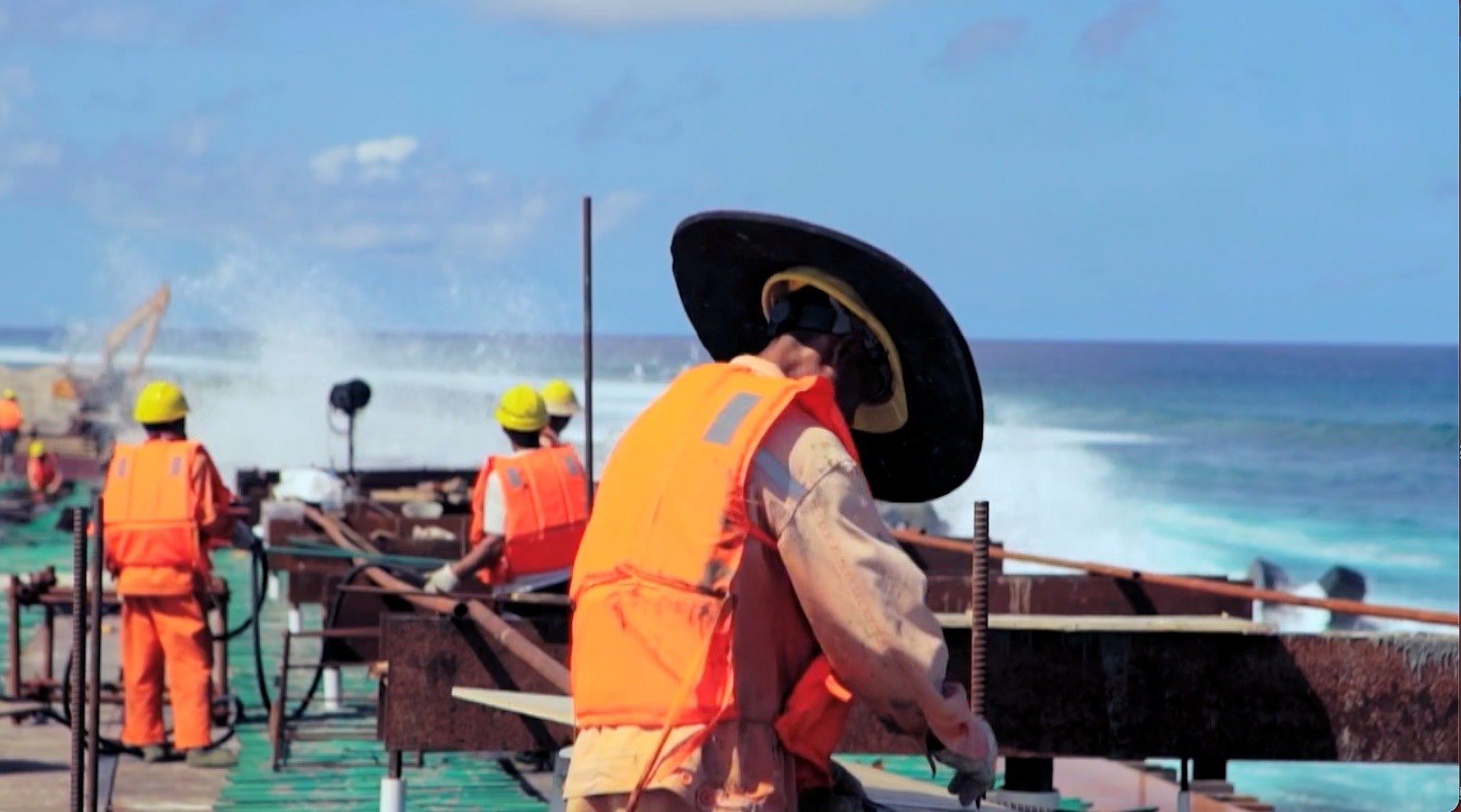 而此時(shí),在兩公里外的嘎杜海峽上,中國(guó)建設(shè)者正與驚濤駭浪斗、 與高溫高濕斗、與復(fù)雜地質(zhì)斗……