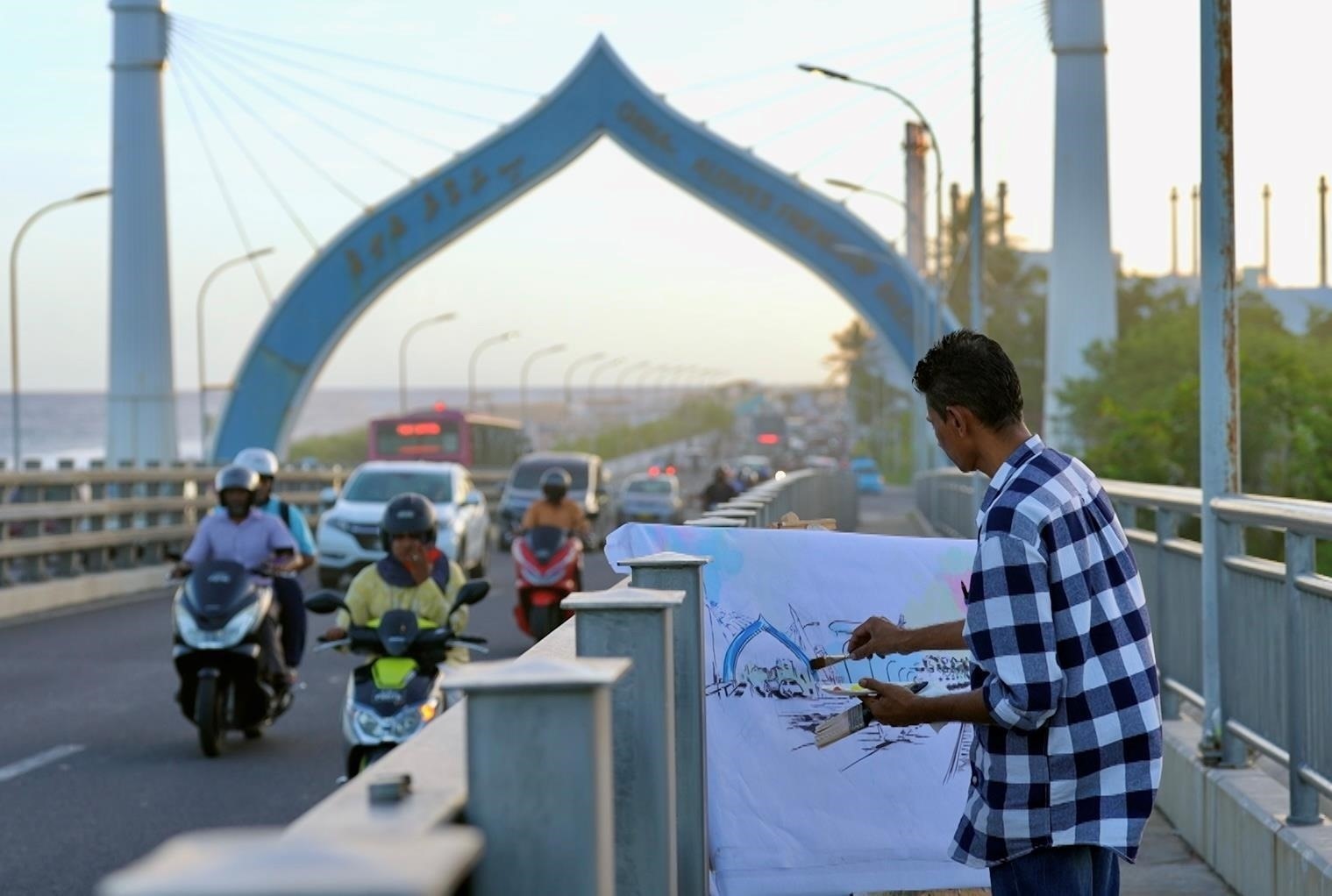 馬爾代夫首都馬累,市中心最熱鬧的花園里,陽(yáng)光在墻面灑下斑駁樹影,一座大橋跨海而立。這是畫家阿米爾在2016年創(chuàng)作的一幅大型壁畫。