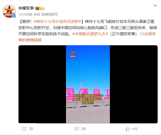 據(jù)“央視軍事”微博賬號報道 神舟十七號飛船按計劃本月(十月)將從酒泉衛(wèi)星發(fā)射中心發(fā)射升空,對接中國空間站核心艙前向端口,形成三艙三船組合體,繼續(xù)開展空間科學(xué)實驗和技術(shù)試驗。