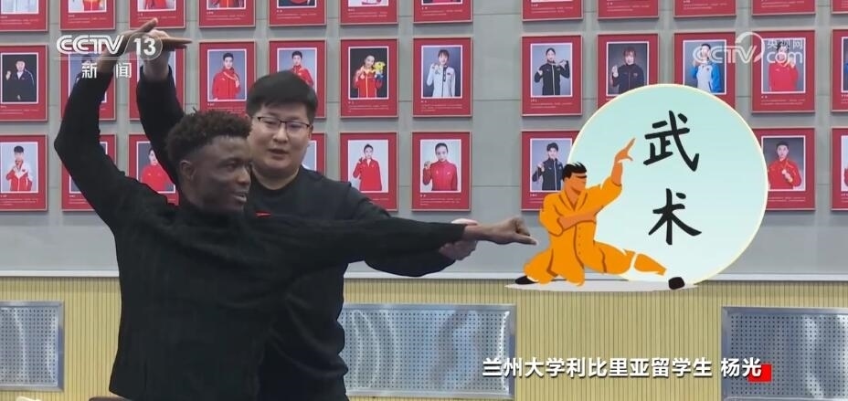 蘭州大學(xué)國際文化交流學(xué)院 利比里亞留學(xué)生 楊光:我已經(jīng)學(xué)中文一年半了,我喜歡中文,最喜歡武術(shù),我喜歡看很多中國的電影,特別是成龍的電影,因為他的動作很多。
