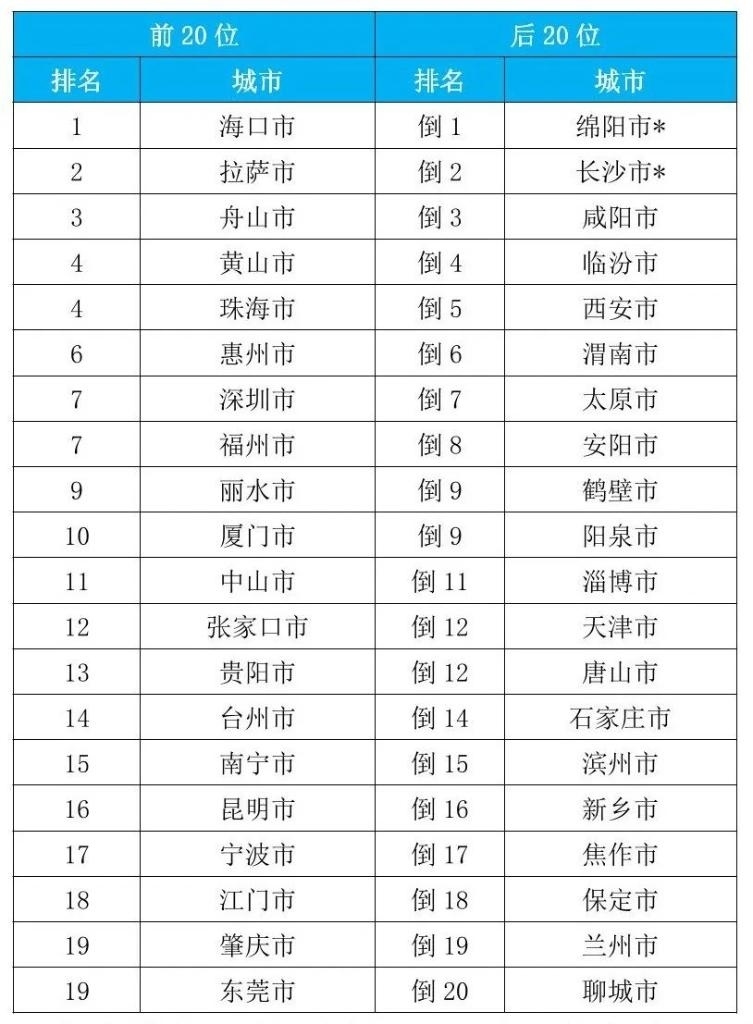 從重點城市排名看,1至9月,168個重點城市中,空氣質(zhì)量排名前20位城市依次是???、拉薩和舟山等城市(從第1名至并列第19名);空氣質(zhì)量排名后20位城市依次是綿陽、長沙和咸陽等城市(從倒數(shù)第1名至倒數(shù)第20名)。據(jù)了解,綿陽市的一個監(jiān)測站點4月和5月、長沙市的一個監(jiān)測站點6月受到嚴重人為干擾,生態(tài)環(huán)境部對所在城市當(dāng)月六項污染物濃度進行了最大值替代處理。(記者高敬)