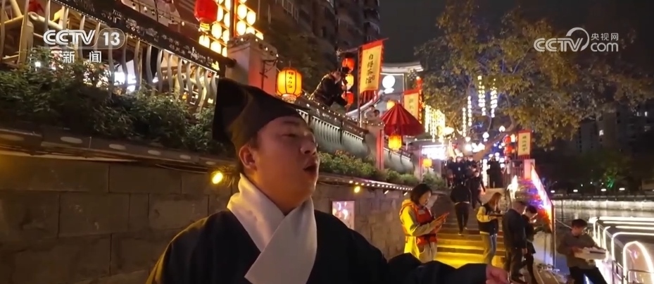 夜幕降臨,華燈初上,在成都東門(mén)碼頭,身穿漢服的演員或是在點(diǎn)茶待客,或是在與游客對(duì)詩(shī)。一曲罷后,游客登上游船,不僅可以欣賞菩提燈光秀,還可以品味曲藝壩壩茶感受優(yōu)雅詩(shī)意。