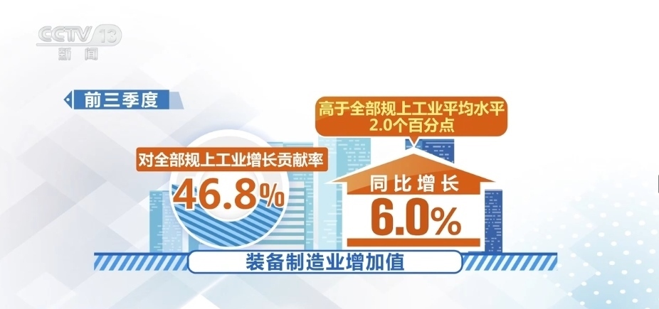 前三季度,在工業(yè)41個(gè)大類行業(yè)中,27個(gè)行業(yè)增加值實(shí)現(xiàn)增長(zhǎng),增長(zhǎng)面達(dá)65.9%。其中,裝備制造業(yè)增加值同比增長(zhǎng)6.0%,高于全部規(guī)上工業(yè)平均水平2.0個(gè)百分點(diǎn),對(duì)全部規(guī)上工業(yè)增長(zhǎng)貢獻(xiàn)率達(dá)46.8%。