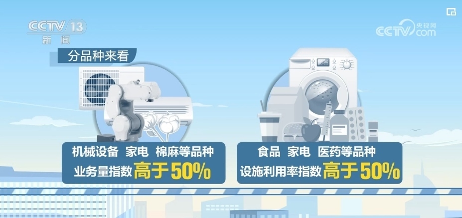 分品種來看,機械設備、家電、棉麻等品種的業(yè)務量指數(shù)高于50%;食品、家電、醫(yī)藥等品種的設施利用率指數(shù)高于50%。