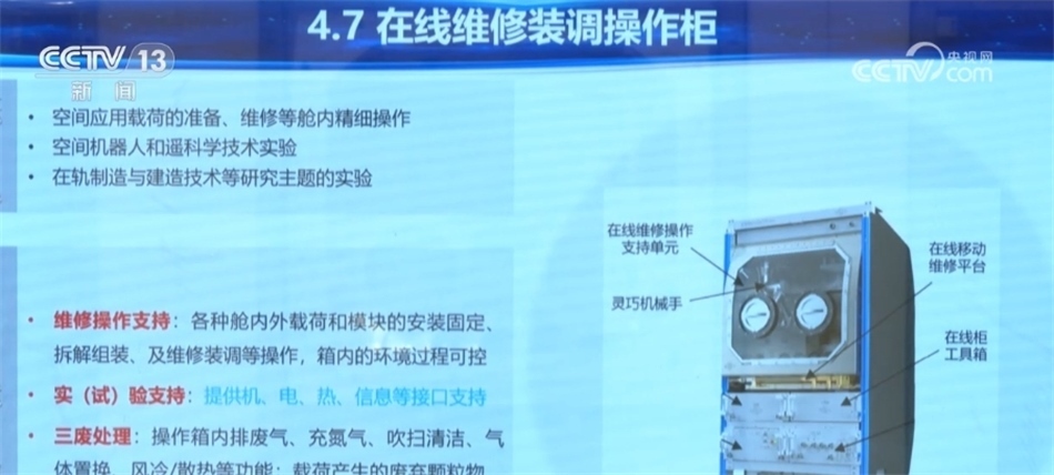 在中國(guó)空間站的艙內(nèi)艙外有大量的設(shè)備,這些設(shè)備一旦出現(xiàn)故障該怎么處理呢?我國(guó)科研人員創(chuàng)新性地研發(fā)了一套“在線維修裝調(diào)操作柜”,有了它,空間站的實(shí)驗(yàn)設(shè)備和載荷一旦出現(xiàn)故障,就可以在軌進(jìn)行維修。下面記者就帶我們一起來(lái)了解這個(gè)中國(guó)空間站的設(shè)備維修“利器”。