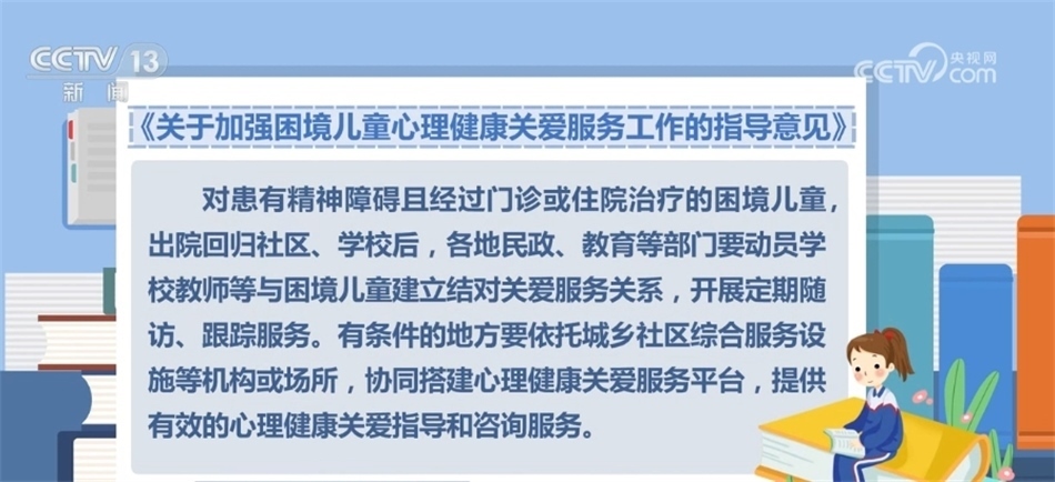 對患有精神障礙且經(jīng)過門診或住院治療的困境兒童,出院回歸社區(qū)、學(xué)校后,各地民政、教育等部門要動員學(xué)校教師等與困境兒童建立結(jié)對關(guān)愛服務(wù)關(guān)系,開展定期隨訪、跟蹤服務(wù)。有條件的地方要依托城鄉(xiāng)社區(qū)綜合服務(wù)設(shè)施等機(jī)構(gòu)或場所,協(xié)同搭建心理健康關(guān)愛服務(wù)平臺,提供有效的心理健康關(guān)愛指導(dǎo)和咨詢服務(wù)。
