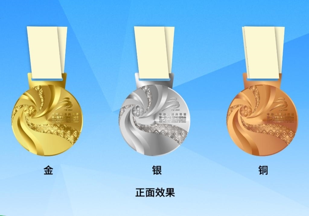 首屆學(xué)青會獎牌正面采用繡球、壯錦等廣西元素,以繡球為設(shè)計焦點,通過壯錦飄帶向外綻放,如一朵盛開的鮮花,表達歡迎四方友人共赴學(xué)青盛會的美意;獎牌背面以廣西銅鼓鼓面為原型,中心太陽紋象征著年輕人的活力和熱情,四方配以圖騰鳥,有著吉祥的寓意;外圈環(huán)繞了學(xué)青會的英文名稱和銅鼓經(jīng)典紋飾云雷紋。獎牌整體寓意“團結(jié)、活力、綻放”。