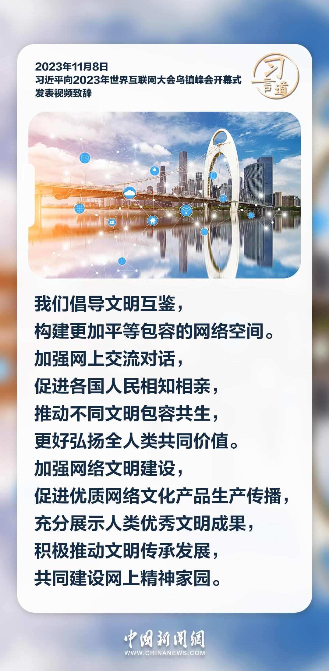 11月8日上午,國(guó)家主席習(xí)近平向2023年世界互聯(lián)網(wǎng)大會(huì)烏鎮(zhèn)峰會(huì)開(kāi)幕式發(fā)表視頻致辭。習(xí)近平指出——