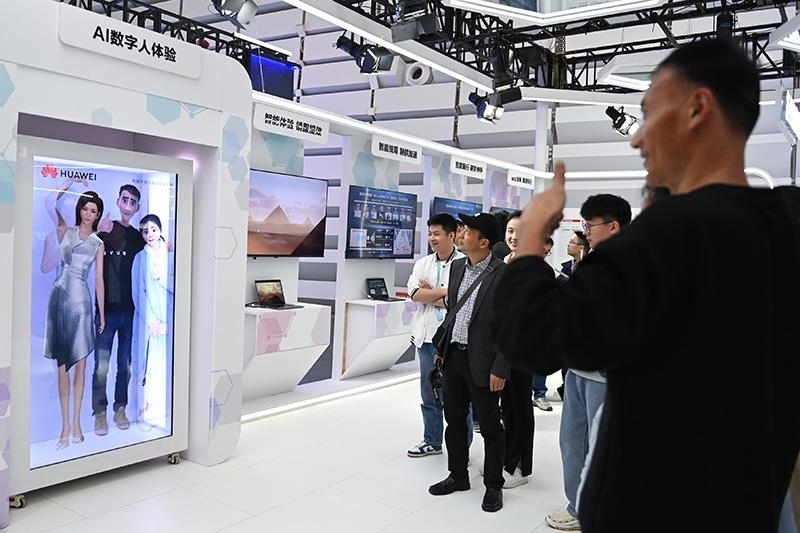 △2023年11月7日,2023年世界互聯(lián)網(wǎng)大會“互聯(lián)網(wǎng)之光”博覽會在浙江烏鎮(zhèn)開幕。圖為觀眾在展臺體驗(yàn)與AI數(shù)字人合影。