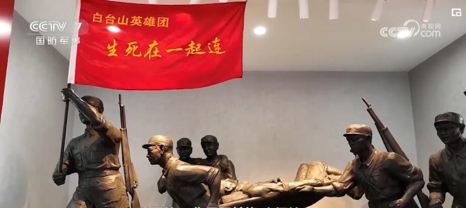 軍事記者 張喬普:在這個(gè)旅的旅史長(zhǎng)廊,在我身旁的這些櫥窗,我看到了包括“生死在一起”連在內(nèi)的,一共17個(gè)英模單位的旗幟。這一面面鮮紅的戰(zhàn)旗,見證、記錄了這個(gè)旅代代官兵一路從抗日戰(zhàn)爭(zhēng)時(shí)期到抗美援朝浴血奮戰(zhàn)、英勇無(wú)畏的戰(zhàn)斗足跡。其中最引人注目的就是我身旁的這面“白臺(tái)山英雄團(tuán)”的戰(zhàn)旗。這面戰(zhàn)旗曾參加國(guó)慶70周年閱兵,在天安門廣場(chǎng)接受黨和人民的檢閱。而她的精神內(nèi)核,就是“生死在一起”。