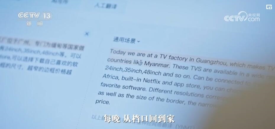 方菁:這是我們找的專門做外貿電視機的一家(工廠)。我給大家介紹一下,“大家好,我是方菁,今天我們來到了電視機工廠”。要介紹得更精密的時候,我就不知道該怎么說了。打開我的翻譯軟件,先把我要呈現的字幕輸入進去。