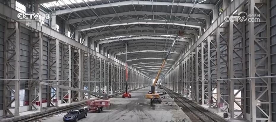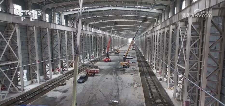 總臺(tái)記者 崔寧:在我的身后有一小一大、一舊一新兩座換裝庫,它們主要是對(duì)入境的中歐班列進(jìn)行換裝。小的這座看起來也比較舊,它建于2008年,到目前為止已經(jīng)投用了整整15年。隨著“一帶一路”倡議的不斷推進(jìn),現(xiàn)在經(jīng)阿拉山口口岸出入境的中歐班列數(shù)量已經(jīng)由最初月均3.5列增加到日均17列。所以,它的存在也已經(jīng)遠(yuǎn)遠(yuǎn)不能滿足現(xiàn)在發(fā)展的需求,也正因?yàn)槿绱耍谒呐赃呌中陆艘蛔蟮膿Q裝庫,它建成投用之后將取而代之成為目前亞洲最大的室內(nèi)集裝箱換裝庫。