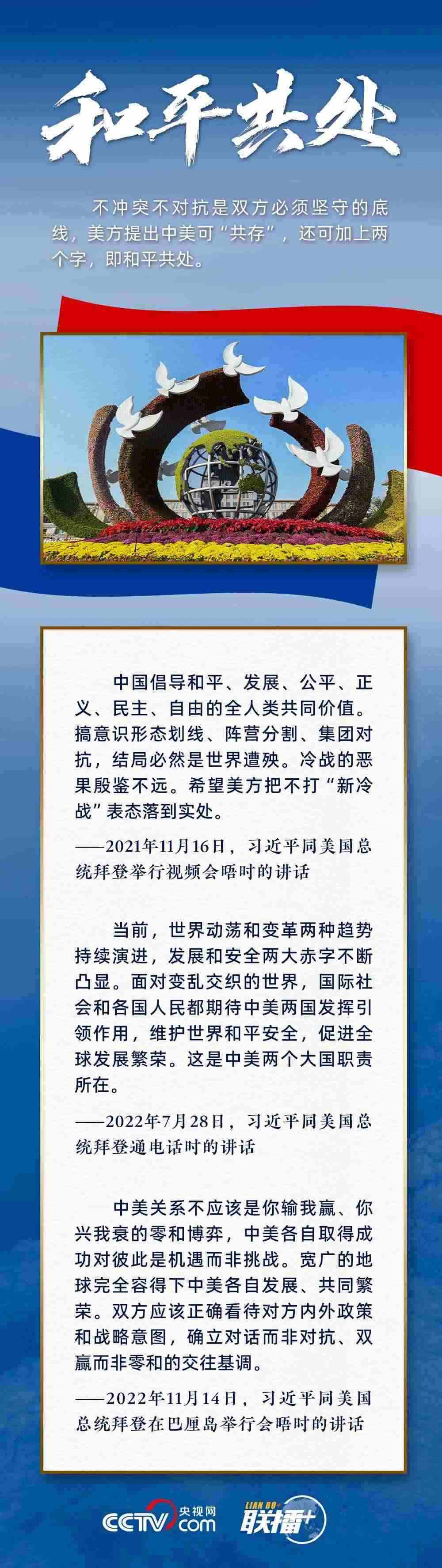 “中美不沖突、不對抗、和平共處,這是兩國最基本的共同利益?!绷?xí)主席指出,遵守國際關(guān)系基本準(zhǔn)則和中美三個聯(lián)合公報,這是雙方管控矛盾分歧、防止對抗沖突的關(guān)鍵,也是中美關(guān)系最重要的防護和安全網(wǎng)。