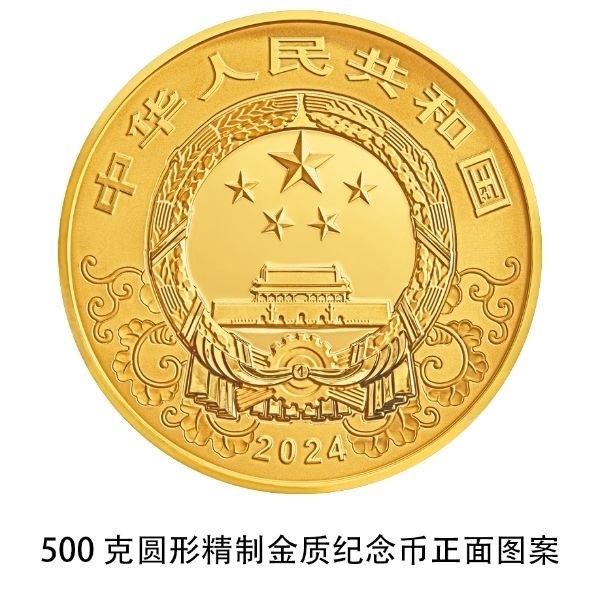 500克圓形金質(zhì)紀(jì)念幣為精制幣,含純金500克,直徑80毫米,面額5000元,成色99.9%,最大發(fā)行量500枚。