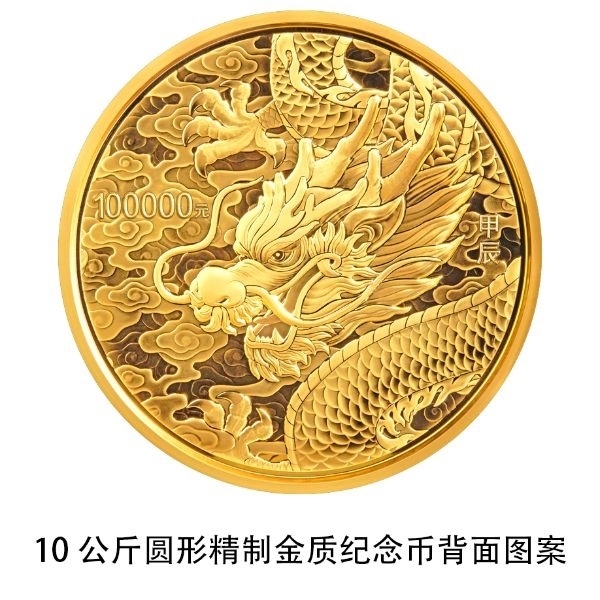 10公斤圓形金質(zhì)紀(jì)念幣背面圖案為龍?jiān)煨?,襯以祥云組合設(shè)計(jì)。