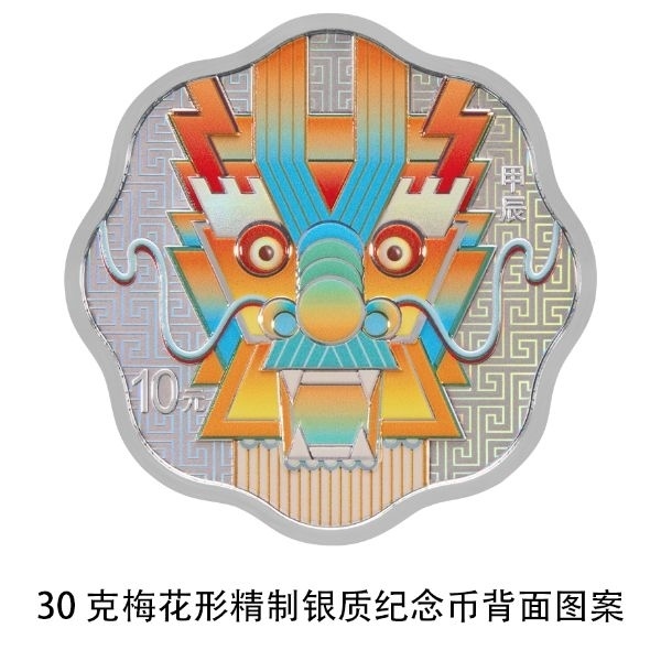 30克梅花形銀質(zhì)紀(jì)念幣背面圖案為裝飾龍?jiān)煨?,襯以回紋紋飾。