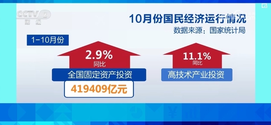 從投資來看,固定資產(chǎn)投資規(guī)模繼續(xù)擴(kuò)大。1—10月份,全國固定資產(chǎn)投資419409億元,同比增長2.9%。其中,高技術(shù)產(chǎn)業(yè)投資同比增長11.1%,增長較快。