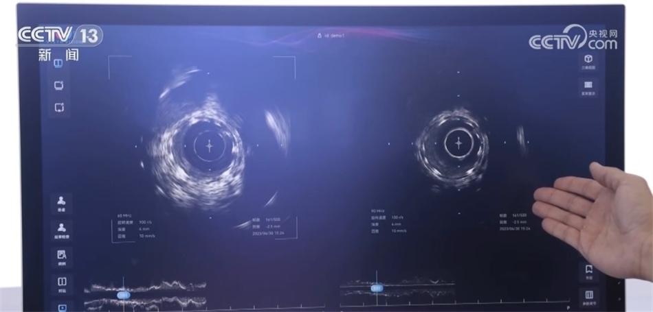 總臺(tái)央視記者 褚爾嘉:這里是一個(gè)傳統(tǒng)的血管的超聲圖像,我們可以看到血管的全貌。右邊這里是一個(gè)工作頻率高達(dá)100兆赫茲的超高頻的血管內(nèi)超聲圖像,通過技術(shù)升級(jí),現(xiàn)在我們可以更加清晰地看到冠狀動(dòng)脈的精細(xì)結(jié)構(gòu),這也是目前世界上清晰度最高的一個(gè)血管內(nèi)的超聲圖像。