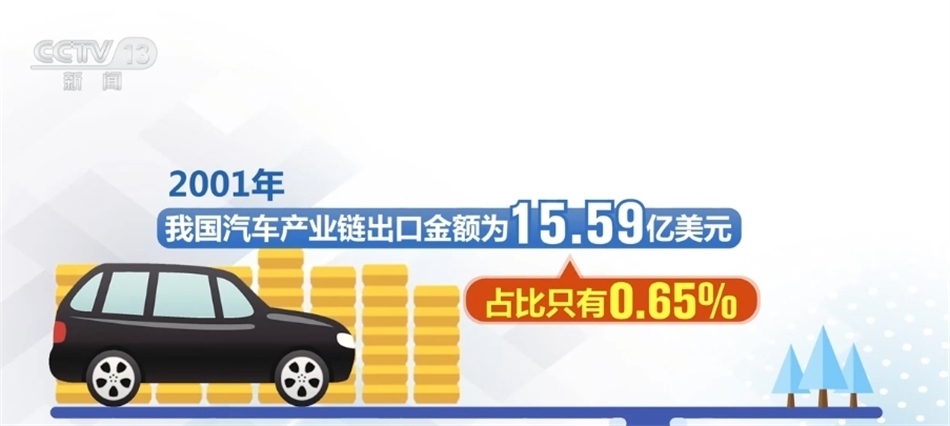 中國貿(mào)促會(huì)汽車分會(huì)負(fù)責(zé)人表示,2001年,我國汽車產(chǎn)業(yè)鏈出口金額為15.59億美元,占比只有0.65%。今年前8個(gè)月,這個(gè)數(shù)字達(dá)到1219.93億美元,占比提升至5.5%。