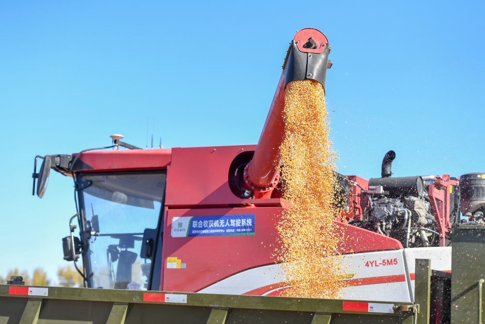 在中國(guó)科學(xué)院“黑土糧倉(cāng)”科技會(huì)戰(zhàn)長(zhǎng)春示范區(qū)公主嶺示范基地,無(wú)人駕駛農(nóng)機(jī)將收獲的玉米裝車(2023年10月19日攝)。新華社記者 張楠 攝