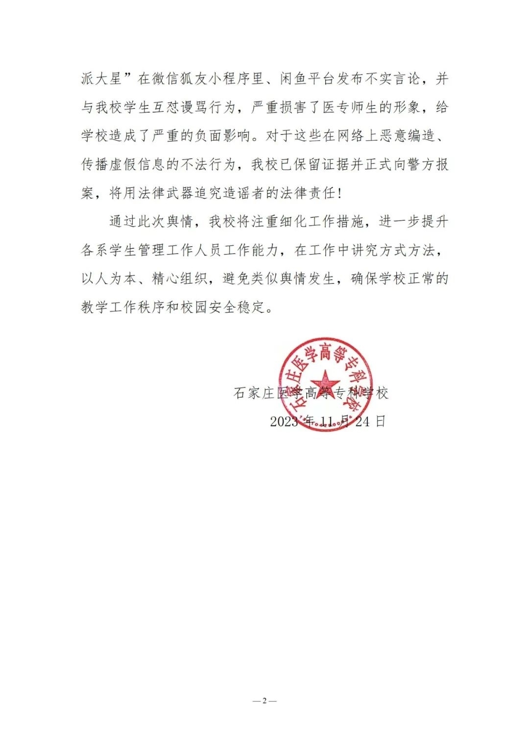 央視網(wǎng)消息:近日,網(wǎng)傳石家莊醫(yī)學(xué)高等??茖W(xué)校檢查學(xué)生宿舍,并將沒收來的物品掛在二手平臺(tái)咸魚上出售,事件引發(fā)關(guān)注。11月24日,石家莊醫(yī)學(xué)高等??茖W(xué)校發(fā)布聲明稱,22日學(xué)校利用學(xué)生在宿舍時(shí)間,排查大功率違規(guī)電器。查獲違規(guī)電器分別由各系登記造表、統(tǒng)一保管,定于放寒假時(shí)返還學(xué)生帶回家。經(jīng)核實(shí),網(wǎng)傳短視頻實(shí)為學(xué)生準(zhǔn)備去實(shí)習(xí)一起收拾房間物品時(shí)的視頻,被別有用心人員移花接木、惡意引用。此外,網(wǎng)名為“林北我叫派大星”在微信狐友小程序里、閑魚平臺(tái)發(fā)布不實(shí)言論,并與學(xué)校學(xué)生互懟謾罵行為,嚴(yán)重?fù)p害了醫(yī)專師生的形象,給學(xué)校造成了嚴(yán)重的負(fù)面影響。學(xué)校已保留證據(jù)并正式向警方報(bào)案。