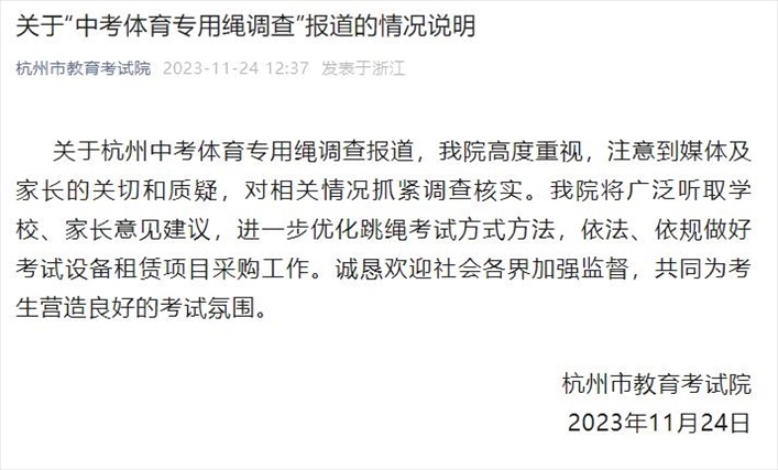 ·中考體育專用跳繩一根賣78元?杭州市教育考試院回應(yīng):抓緊調(diào)查核實(shí)。