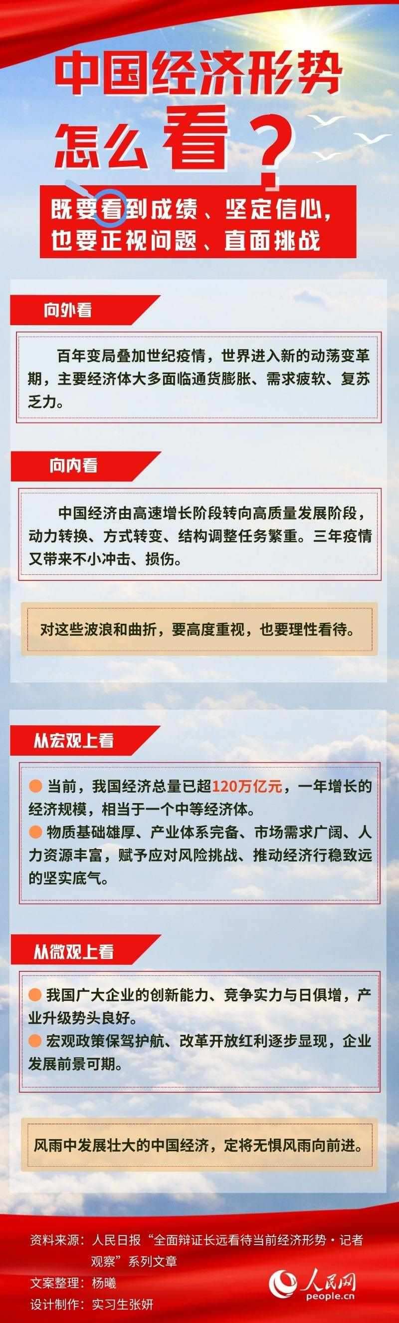 今年以來,我國經(jīng)濟(jì)總體回升向好,高質(zhì)量發(fā)展扎實(shí)推進(jìn)。讀懂中國經(jīng)濟(jì),要看到成績、堅(jiān)定信心,也要正視問題、直面挑戰(zhàn)。只有全面辯證長遠(yuǎn)看待,才能準(zhǔn)確把握經(jīng)濟(jì)發(fā)展中的積極因素,形成推動(dòng)高質(zhì)量發(fā)展的強(qiáng)大動(dòng)力。身處百年未有之大變局,把握優(yōu)勢、堅(jiān)定前行信心,定能推動(dòng)我國經(jīng)濟(jì)乘風(fēng)破浪向前、邁上更高臺階。