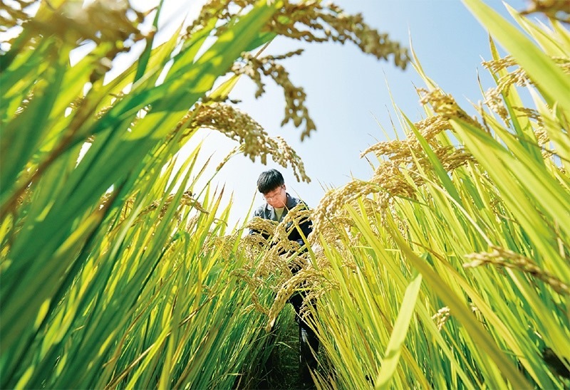 近年來,河北省唐山市通過鹽堿地土壤科學(xué)改良、耐堿作物品種培育、適用耕作技術(shù)研究應(yīng)用等系列治理措施,在鹽堿地上開發(fā)建設(shè)了高標(biāo)準(zhǔn)農(nóng)田88.6萬畝,有效提高鹽堿地利用水平。圖為2023年10月11日,農(nóng)業(yè)科研人員在唐山市曹妃甸區(qū)第五農(nóng)場(chǎng)鹽堿地改良而成的高標(biāo)準(zhǔn)稻田內(nèi)工作。 新華社記者 楊世堯/攝