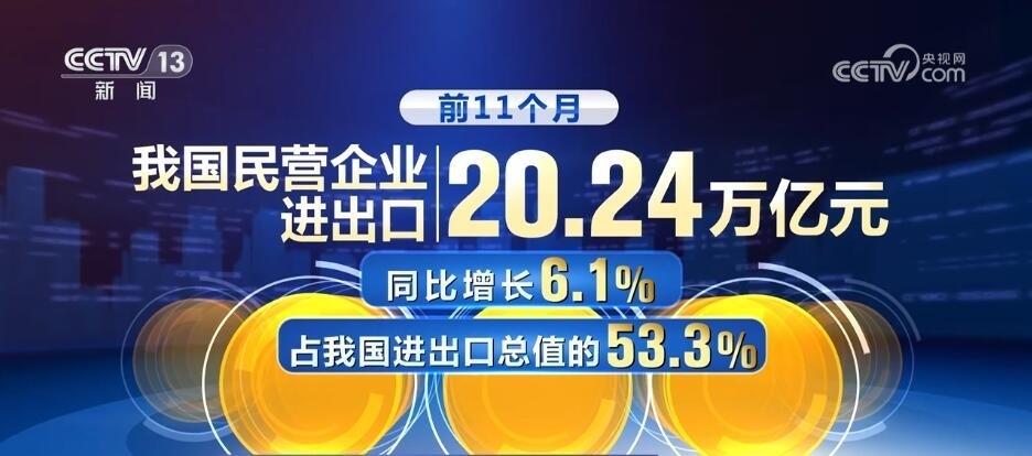 前11個月,我國民營企業(yè)進(jìn)出口20.24萬億元,同比增長6.1%,占我國進(jìn)出口總值的53.3%,提升3.1個百分點(diǎn)。同期,上海、江蘇、浙江、安徽等長三角區(qū)域合計(jì)進(jìn)出口13.87萬億元,同比增長0.6%,其中出口同比增長1%,拉動同期我國出口增長0.4個百分點(diǎn),強(qiáng)勁活躍的增長極功能不斷鞏固提升。???????